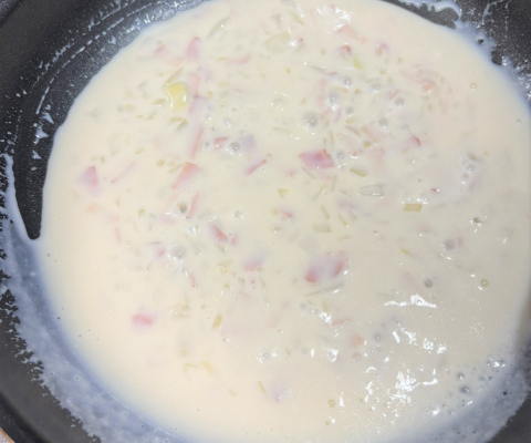 水とコンソメを加え煮立たせたら、混ぜ合わせておいた米粉と牛乳を加えてとろみがつくまで中火で熱します。