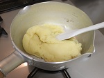 生地が冷めないうちに、ほぐした卵を少しずつ加えながら木べらなどでよく練ります。