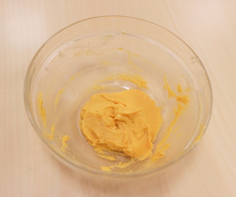 室温に戻して柔らかくしたバターをゴムベラでクリーム状に練り、きび砂糖を入れてすり混ぜ、卵黄を加えて混ぜます。