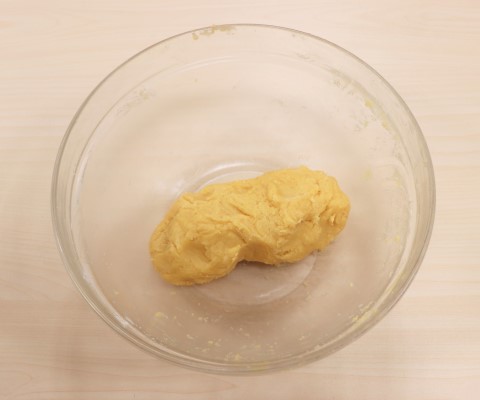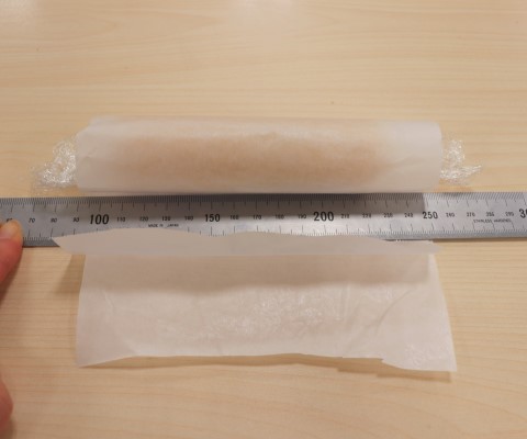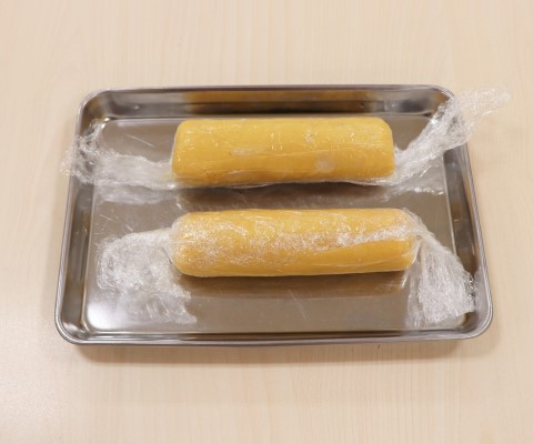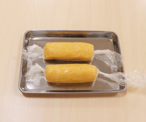 それぞれ直径約3cmの棒状にのばしてラップ材に包み(2本分)ます。 ※焼き上がりは、多少大きくなるので、お好みのサイズより小さめの棒状にしてください。