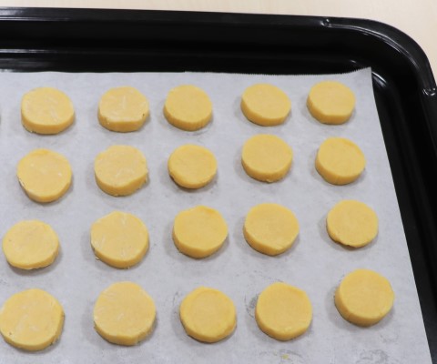 ナイフ等で約1cmの厚さに切り、オーブン用シートを敷いた天板に間隔をあけて並ベます。