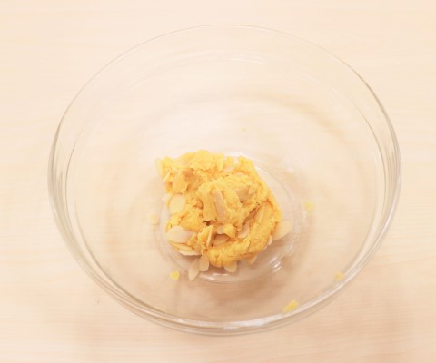 生地を2等分にし、片方にアーモンドスライスを加えて混ぜます。