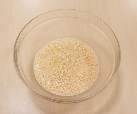 ①に牛乳(または豆乳)を加えて泡をつぶさないように泡立て器で静かに混ぜます。