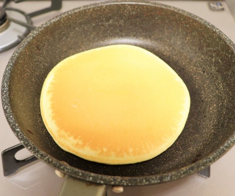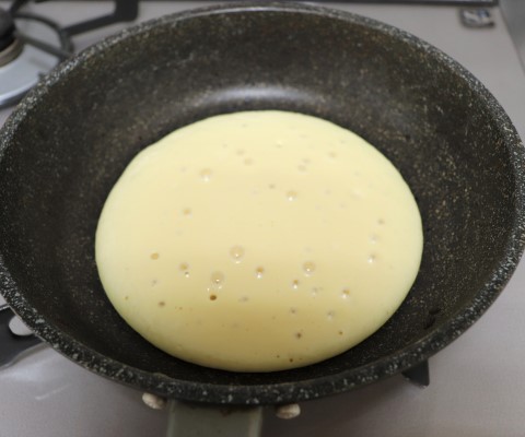 フライパンに④の生地をお玉一杯分流し入れ、表面にプツプツと小さな泡が出てくるまで弱火で3分焼きます。