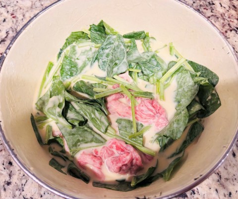 カットしたほうれん草、豚肉を①に加えよく混ぜます。