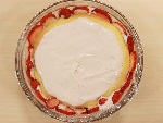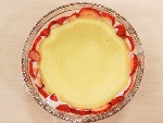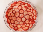 ボウルにラップ材を敷いて、スライスしたいちごを隙間があかないようにきれいに並べます。