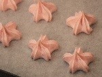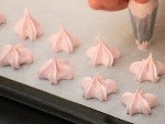 きちんと計量した卵白を乾いたボウルに入れ、ハンドミキサーでふわふわになるまで泡立てます。粉糖を3回に分けて加え、角がピンと立つまでしっかりと泡立てます。最後に準備しておいた食用色素赤を数滴入れて混ぜ、ハンドミキサーを低速にしてキメを整えツヤのある状態にします。(メレンゲ)