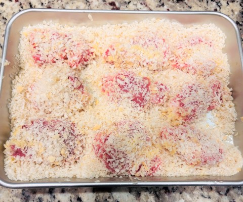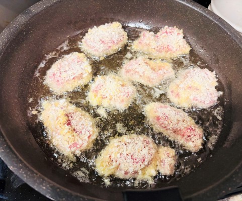 ①の肉を、②のバッター液にくぐらせ、パン粉をつけます。