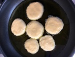 手に少量(分量外)の油をつけ、②の生地を直径約7㎝、厚さ約1.5㎝に成型し③のフライパンで片面5分弱火にし、低温で揚げます(約150℃)。ひっくり返し、もう5分竹串をさしてぬれた生地がつかなくなるまで揚げます。