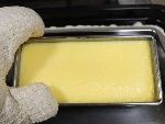 天板の上に耐熱バットと型をのせ、⑦をこしてから、②の型に流し入れます。表面に泡が残っている場合は取り除きます。泡があるとすが入ってしまう場合があります。耐熱バットにお湯(分量外)を注ぎます(湯せん焼き)。