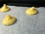 丸口金をつけた絞り出し袋に②の生地を入れ、オーブン用シートを敷いた天板に直径5cmの山形に絞り出し、生地の先をぬらした指でおさえてからきれいなキッチンバサミで十文字に切り込みを入れます。
