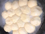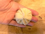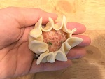 ②の生地を15等分にし丸めたら、約8cmの円形に伸ばし、15等分した③のタネと、15等分にした➀のゼリーをのせ、ひだを作りながらしっかり包み閉じます。