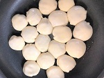 フライパンにサラダ油(分量外)をひき、中火で熱したら④をとじ目を下にして隙間なく並べ、弱火にします。表面にサラダ油(分量外)をハケで塗り、小籠包の1/3程度がつかる量の水(分量外)を加え蓋を閉じて約8分蒸し焼きにします。蓋を開けて、水がなくなるまで中火で焼き上げます。