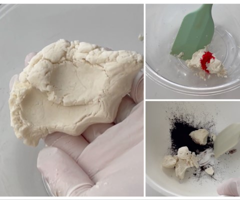半量ずつに分け、赤と黒を加えて混ぜます。