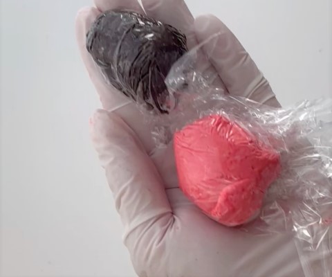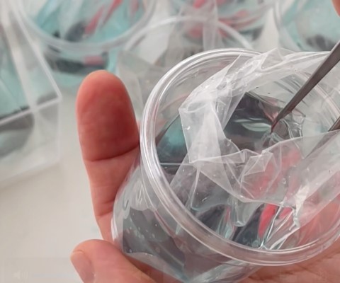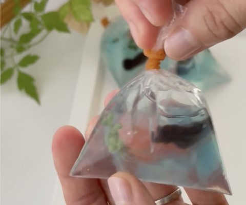 ⑥の残りの1/3量の透明の寒天液を沸かして(またはレンジで)溶かし、⑦の袋に少し足します。輪ゴムで袋をしっかり結んで再度冷やしたら、紐をつけて出来上がりです。