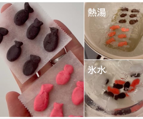 ③の赤黒の生地からそれぞれ魚の形に手で丸めたり、魚型の抜き型で抜きます。