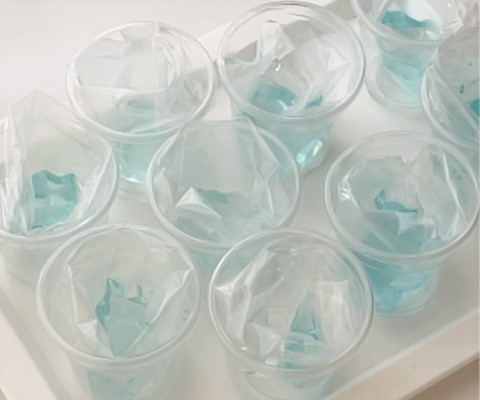 ⑤の2/3の量にかき氷シロップを加えて薄い水色のゼリーを作り、小さなビニール袋に4等分に流し入れて冷やし固めます。