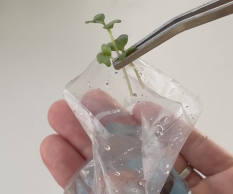 緑系の野菜(藻に見立てたもの)をお好みで入れます。今回はブロッコリスプラウトを使用しました。