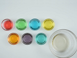 - ②を小さめのボウルに大さじ3程を7つに分け、【A】 を 竹串でそれぞれ少量とって混ぜ合わせ、7色作ります。残った無着色の寒天液も使用しますので、とっておいてください。
