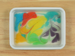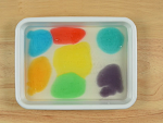 - バットに③の無着色の寒天液を全体に流し入れ、その上に1色ずつかぶらないように流し入れます。スプーンで大きく混ぜマーブル模様にして冷蔵庫で約2時間冷やし固めます。