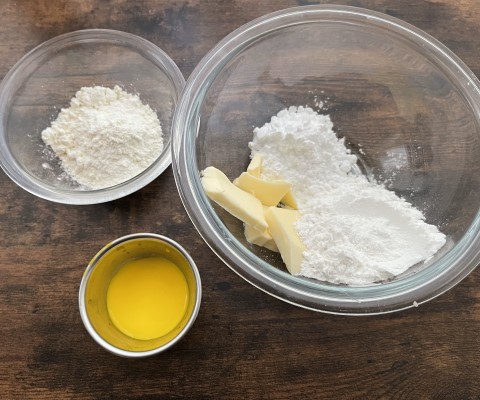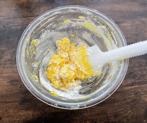 牛乳に食用色素の黄色を完全に溶かし、バター、粉糖、米粉を別のボールに入れ混ぜ合わせ、色素を溶かした牛乳も加えます。(食用色素は、牛乳ではなく薄力粉に混ぜて振るってから加えても良いです)