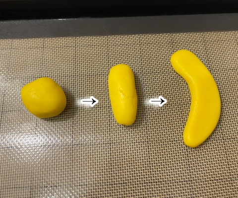 手で少しずつ細長く、8㎝位の長さにしたらつぶしバナナの形に整えます。