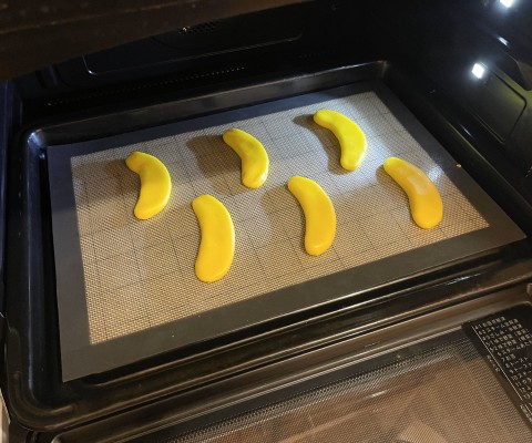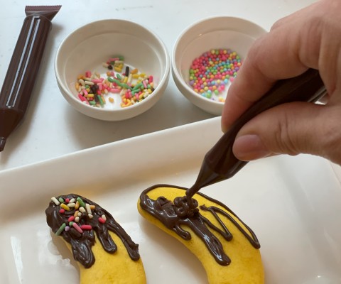表に返し、デコペンで、バナナにチョコが垂れるように描きながらを搾り出し、チョコが固まらないうちにチョコスプレーやトッピングカラーシュガーでデコレーションします。