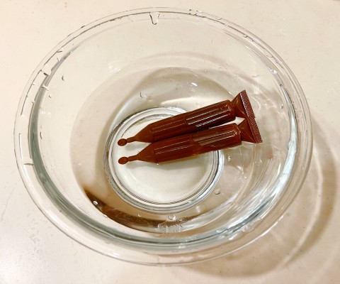 ボウルに40~50℃のお湯を入れ、デコペンをつけます。チョコレートがやわらかくなったら取り出して、タオルに包みよくもみます。※お好みのカラーのデコペンをお使いください。