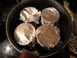 フライパンに蓋をし、ごく弱火(最小限の火力)で15分加熱し、その後火を止めて蓋をしたまま10~15分おきます。※途中蓋をあけないでください。