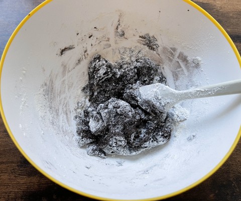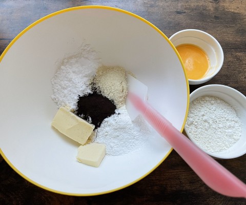 柔らかくなったバターに、粉糖、溶き卵、アーモンドプードル、米粉、ブラックココアパウダーをよく混ぜます。