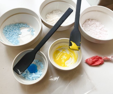 アイシングシュガー(ピンク、黄、青の粉糖)に、牛乳を加えて混ぜ、小さな絞り袋かコルネに入れ、袋をテープで閉じます。白は粉糖20gに牛乳を加えます。