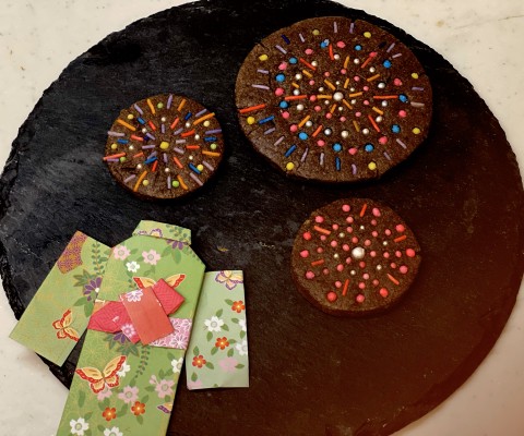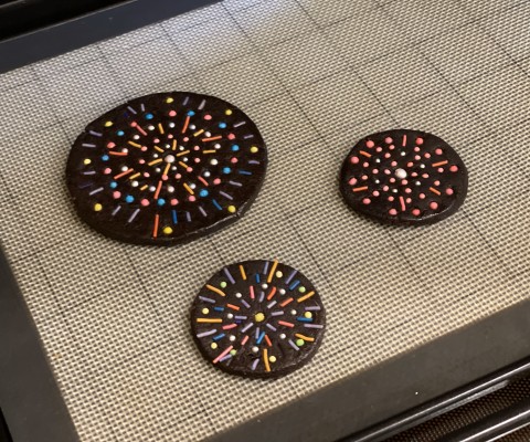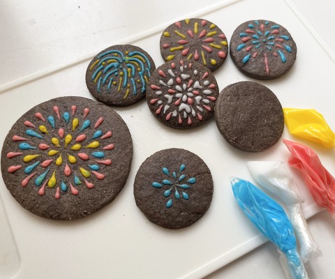 袋やコルネの先を小さくカットして、アイシングを絞り出しながら、クッキーの上に花火の模様を描きます。