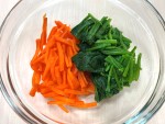 千切りにした人参を2分ほどゆでます。ほうれん草は、沸騰したたっぷりのお湯に塩ひとつまみ(分量外)加えてゆで、冷水にさっとくぐらせ、水気を切り、細かく刻みます。