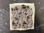 パンをラップ材の上にのせ、めん棒で薄くのばし、その上に②を広げくるくると巻き、ラップ材で包みます。(30分程冷蔵庫にいれて休ませるとなじみが良いです)