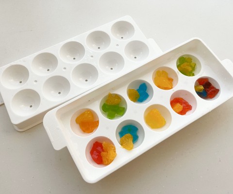 かき氷シロップやフルーツを使い、カラフルなコロコロゼリーを作ります。 まるで縁日のスーパーボールすくいのようです。 ジュースや炭酸水に入れて楽しく召し上がってくださいね。