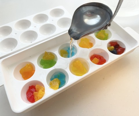 冷え固まったら、5色のゼリーをそれぞれ細かいさいの目切りにして、丸い製氷器の1/3くらいまで入れます。