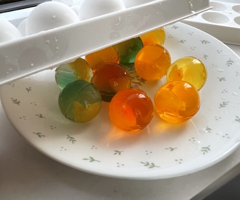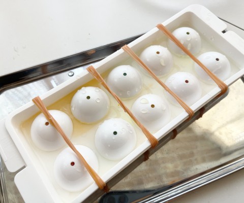 製氷器のまわりをパレットなどで1周してから蓋を取り、ゼリーを皿に取り出します。球体のため転がりやすいのでご注意ください。