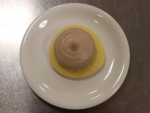 のパンケーキを2枚1組にし、1枚のパンケーキの裏側にのクリームを絞り出し、もう1枚のパンケーキを少し斜めにのせます。※絞り出し袋がない場合は、クリームをスプーンでこんもりのせます。