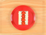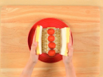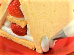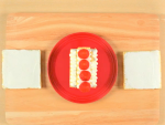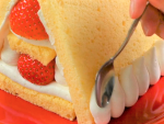 8cmにカットしたスポンジの上に⑩のクリーム絞り、いちごを一列並べ、周りにクリームを絞ります。その上に4cmにカットしたスポンジをのせ、クリームを絞り、同じようにいちごを並べます。(※高さが均一になるように注意します。)12cmの正方形にカットしたスポンジ二枚のそれぞれ片面に、クリームを薄く塗り、屋根として斜めに置きます。