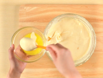 ボウルに卵を入れ、ハンドミキサーで軽くほぐし、湯せん(約60℃)にかけながら泡立てます。