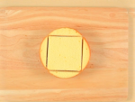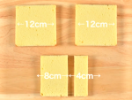 完全に冷めた⑥のスポンジを三枚にスライスし、重ねます。約12cmの正方形になるように周りを切り落とします。三枚の内二枚はそのまま屋根部分として使用し、残る一枚は短辺が4cmと8cmの長方形になるように切ります。(床部分)