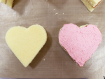 スポンジケーキ(2枚スライス済み)をお好みのハート型で抜きます。2枚を重ねて使用しますので同じ型で抜いてください。