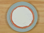 ⑦の一番濃いピンクのクレープ生地をお皿にのせ、⑧のクリームをまわり1cmあけて塗り、平らにならし、クレープを重ね、この作業を3枚分繰り返します。⑥、⑤、④のクレープ生地の順に同様に各3枚分作業を繰り返します。完成したら全体にラップ材をかけて、冷蔵庫に入れ、2時間ほど冷蔵庫で冷やします。
