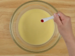 ④の残った生地に【色素液】を付属のスプーンで2杯入れてしっかり混ぜ、薄いピンクの生地を焼きます。この作業を繰り返し、3枚焼いて④の生地の上に重ね、乾かないようにラップ材をして冷ましておきます。
