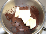 チョコレート、ココアパウダー、バター(食塩不使用)を小ボウルに入れて湯せん(約80℃)で溶かしておきます。