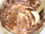 ⑦のボウルの底を冷水にあてて混ぜ、チョコが絞れるくらいの固さになったら、口金を付けた絞り袋に入れます。