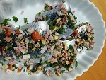 いわしに①を両面にまぶしつけて頭のほうからくるっと二つ折りに巻きます。