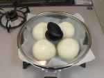 ④を弱火(最小限の火力)で1分加熱し、火をとめます。生地が1.5倍位に膨らむまで約15分程置きます。