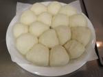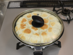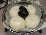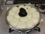①の生地を四等分にして、一つずつ生地をつまんでしっかり口を閉じてきれいに丸め、とじ目を下にして②にのせフライパンに蓋をします。弱火(最小限の火力)で1分加熱し、火をとめます。生地が1.5倍位に膨らむまで約15分程置きます。