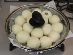 ③を取り出し、一つずつ上から手のひらで押してガス抜きをして丸め直し、一つをさらに四等分にして、チョコレートとクルミを包み入れ③と同様しっかり口を閉じてきれいに丸め、とじ目を下にして再びフライパンに戻し蓋をします。全部で16個出来上がります。